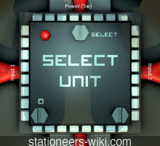Top: Selector Input. Use Screwdriver to select what input is used to flip the selection. This should usually be a unit that outputs a true/false value (0 for false, 1 for true), such as a Logic Compare unit.