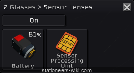 - the slots inside Sensor Lenses* The Sensor Lenses is an equipable device that shows nearby ores directly in the player's HUD. This device fits in the player's Glasses slot. It has two internal inventory slots. The first is for a battery, and the second is for the Sensor Processing Unit which must be manufactured separately.