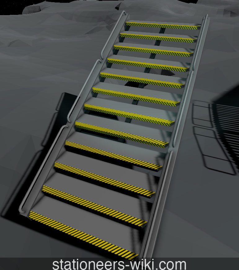 Stairs are created in the Autolathe or Fabricator. They are 1x1x2 (2 blocks long), causing them to have a very gradual slope.