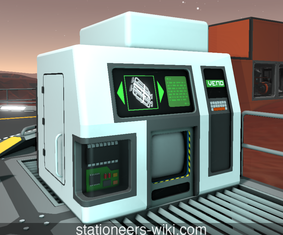 The Vending Machine is a machine used to dispense items to players. The machine can hold up to 100 individual stacks of items. The machine's easy to use interface lets the user choose an item (displayed in the picture window) and dispense it with the press of a button.